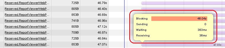 Also, since the images are being created dynamically by SSRS, they are given a unique identifier which is not cached – so the end result may be the same image that is already displayed multiple times. Given the fact that all these are relatively small in size – under 1KB – and that rendering takes advantage of a pretty gutsy backend hardware you can imagine how unimpressed I was when the report took 48 seconds to fully display. Also, majority of those will be run by the client’s customers over WAN spread out all over the country so there is an extra cost associated with traversing the Internet, not just our LAN. Below is a short screen capture footage displaying the report’s unacceptable execution speed.